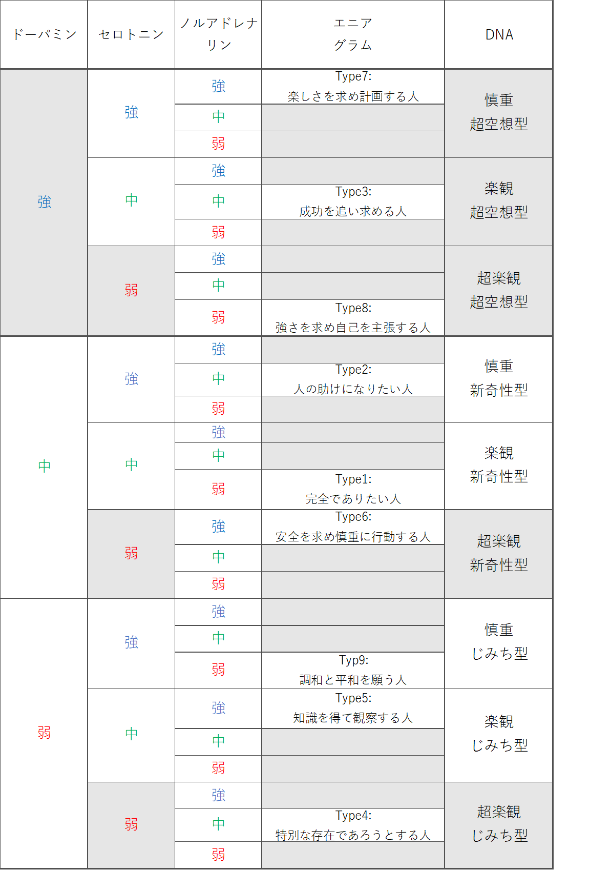 脳内伝達物質とエニアグラム、DNA検査による関係は、以下のようになるようです。